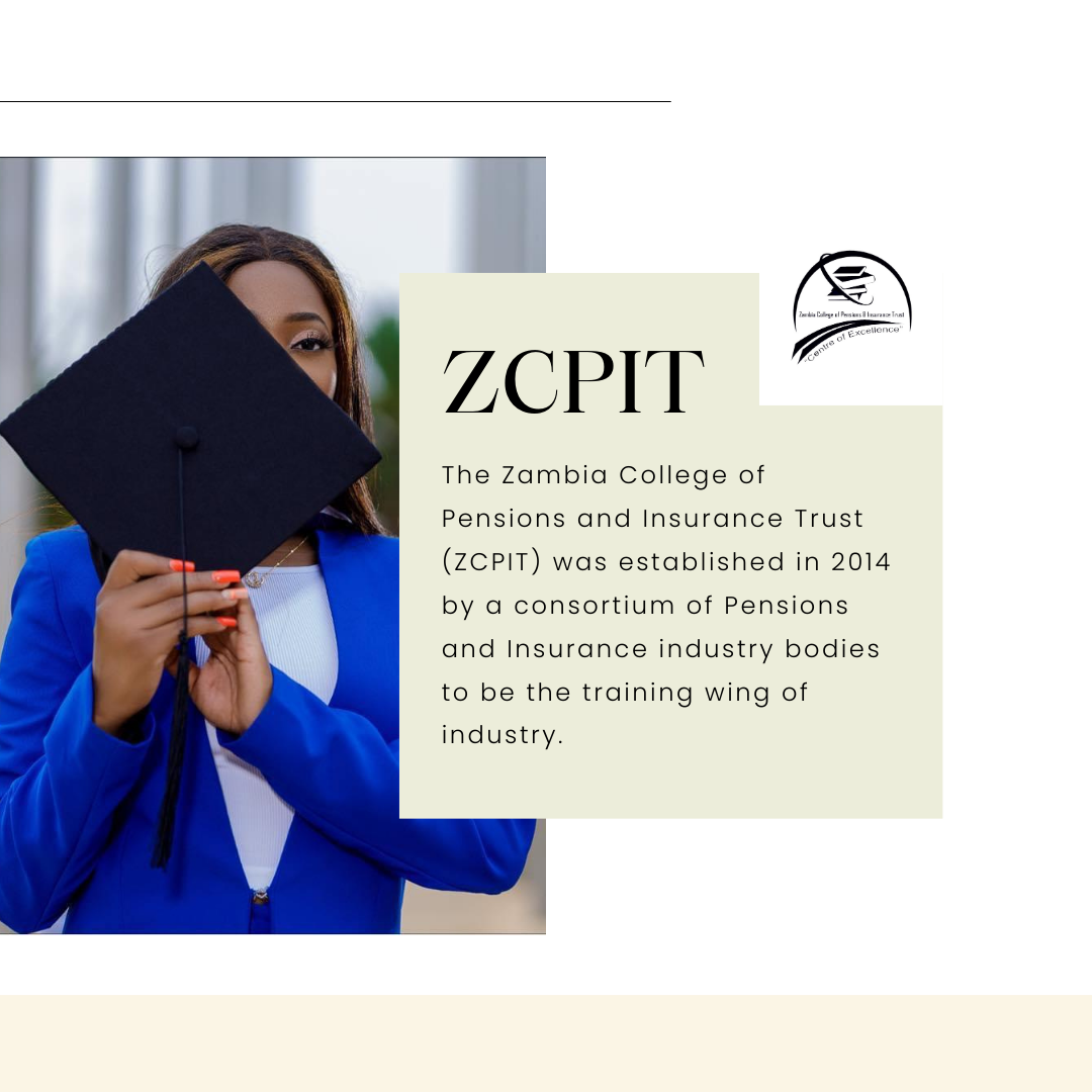 ZCPIT is the premier college of insurance and pensions education and training in Zambia. It specializes in providing professional and vocational training leading to the award of certifications in insurance, pension administration and other related business studies. The ZCPIT trust was established on 14th December 2014 and is registered under the Land (Perpetual Succession) Act Cap 186 of the Laws of the Republic of Zambia, with Ministry of Lands registry. It commenced operations on 1st April 2015.